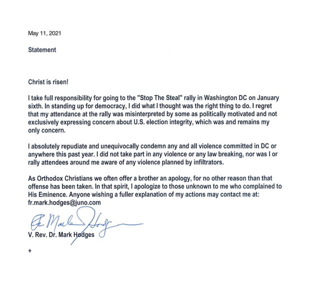 For additional context, and to form your own judgment on how this matter has been resolved, see the Mark Hodges: The Scandal section in our Archives 2020-21, and especially Open Letter: OCA Priest Participates in Trump Riot, Reported to FBI. You may share your thoughts with Archbishop Paul (Gassios) at bishoppaul@domoca.org or (312) 202-0420. (Contact information publicly available on the OCA website.)